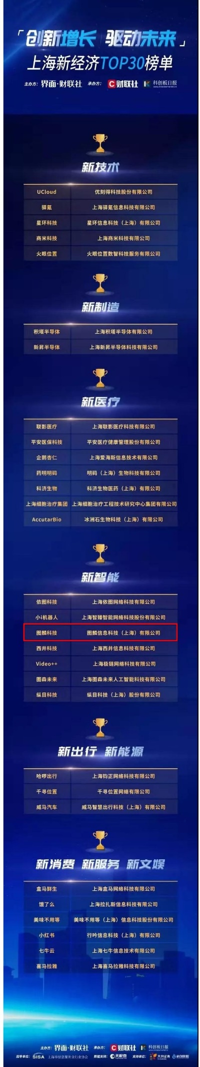 据悉,本次榜单是由界面·财联社,联合科创板日报、上海市信息服务业行业协会、天眼查、科创联盟、天风证券等重量级单位,通过对企业的高成长性、核心技术、模式创新、创始团队、融资轮次等多个维度进行考核、筛选评出,旨在致敬上海新经济,树立上海产业新标杆。